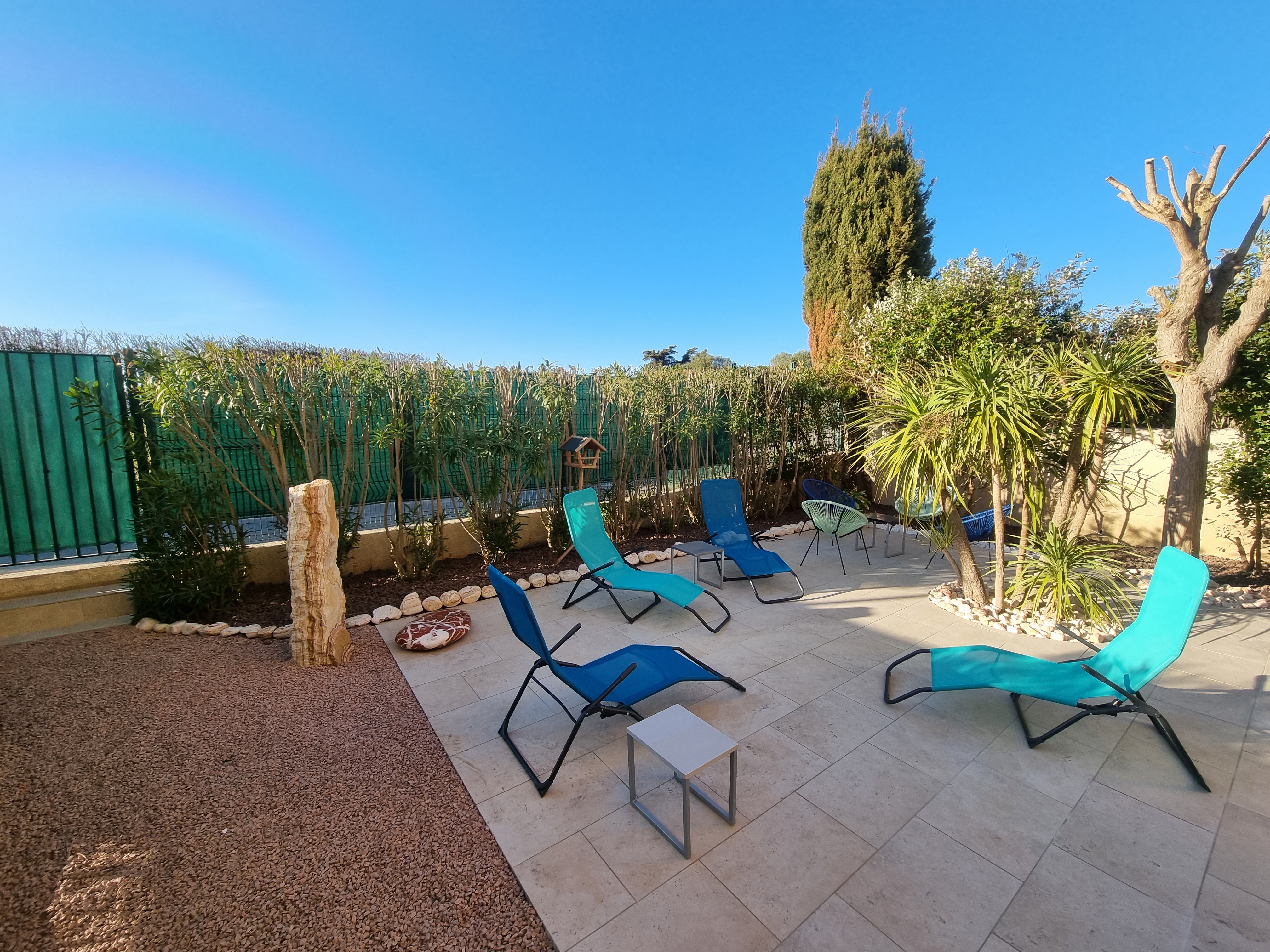 1 Terrasse: 55 m2 dont 15m2 abrité avec un joli jardin arboré en gazon synthétique: 55m2 au calme (aucun bruit de voitures). 1 parking privatif