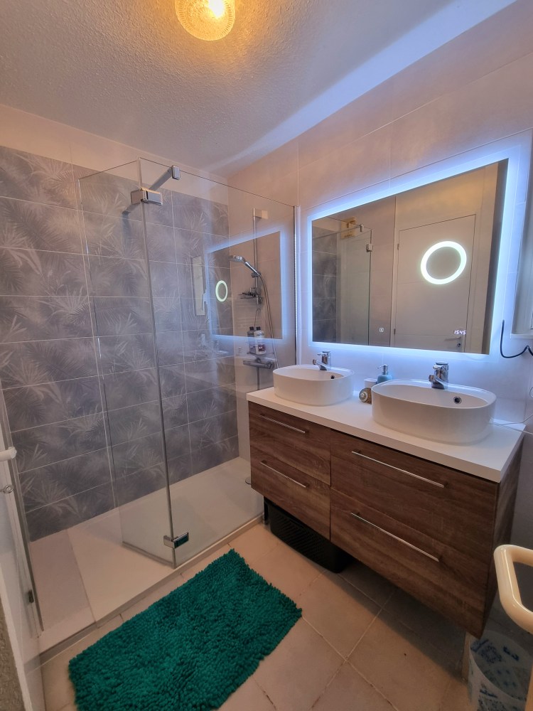 Salle de douche: douche l’italienne 1m60x0,90, double vasque, grand miroir connecté, sèche cheveux et serviette avec fenêtre donnant sur le jardin, WC séparé.
