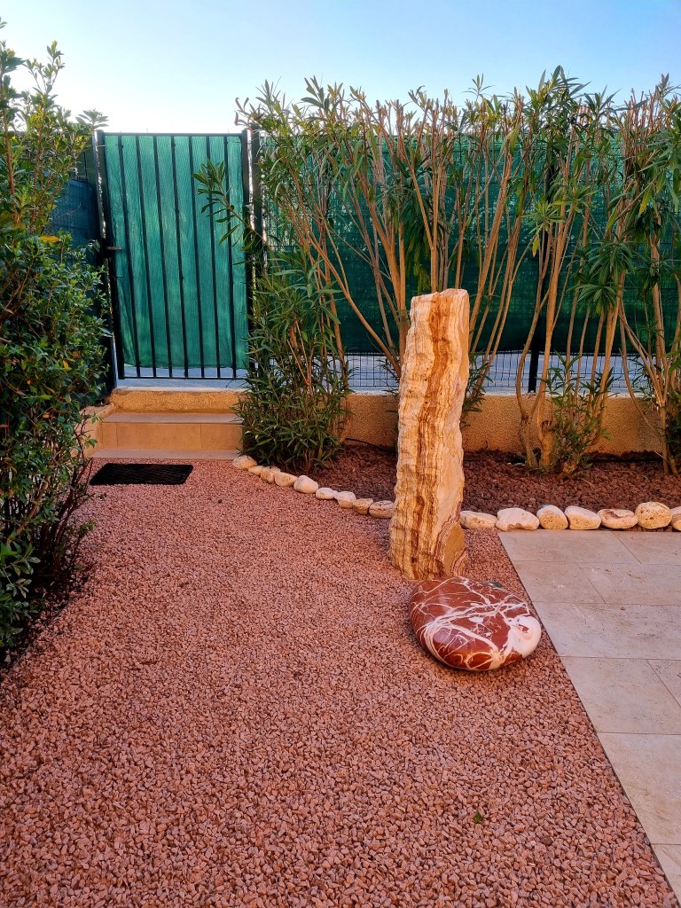 terrain de boules, jolis parc fleuri, gardien sur place